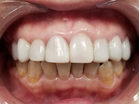 Patient has permanent staining on her teeth due to intake of tetracyline when she was a child. Her previous dentist had put on layers of composite fillings to mask the discoloration of her top front teeth.
